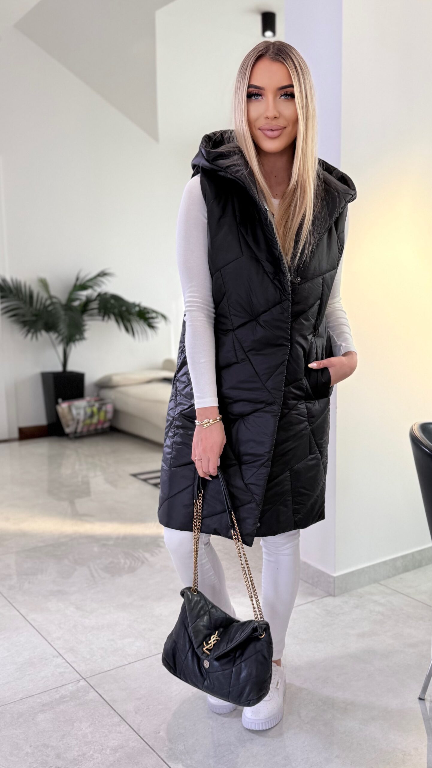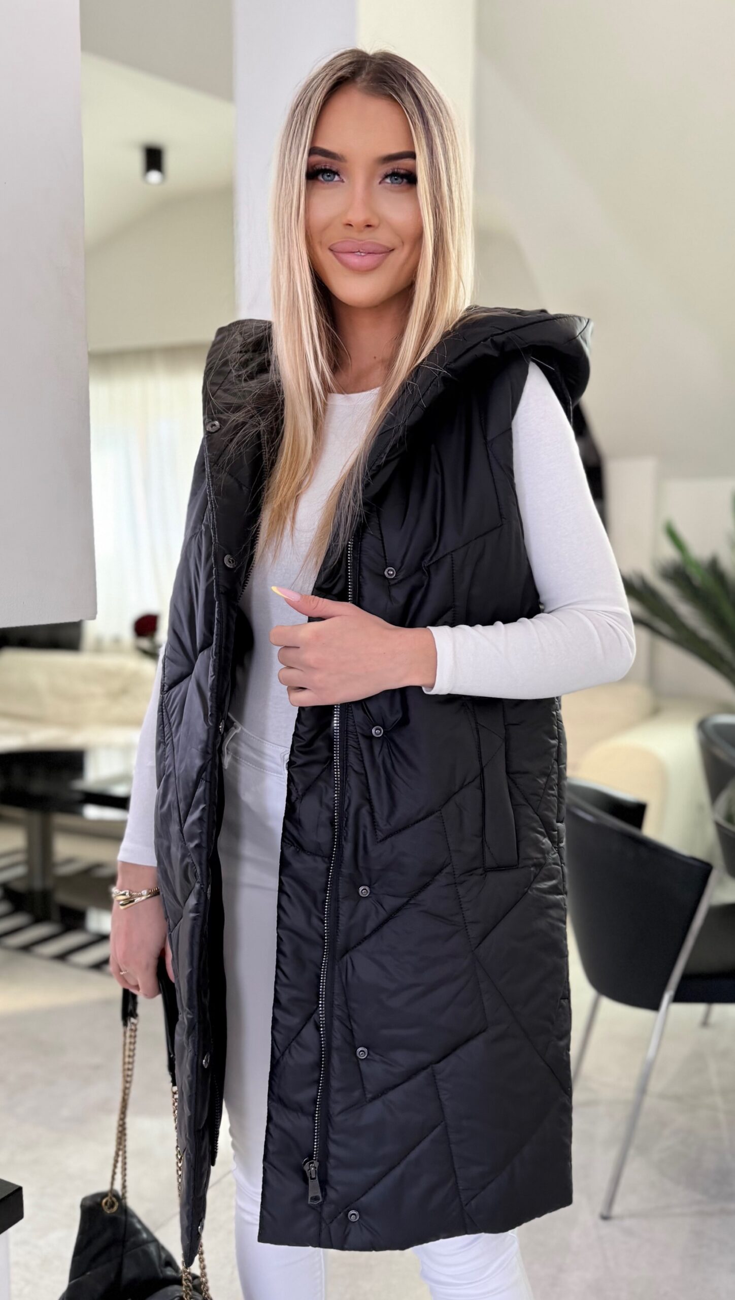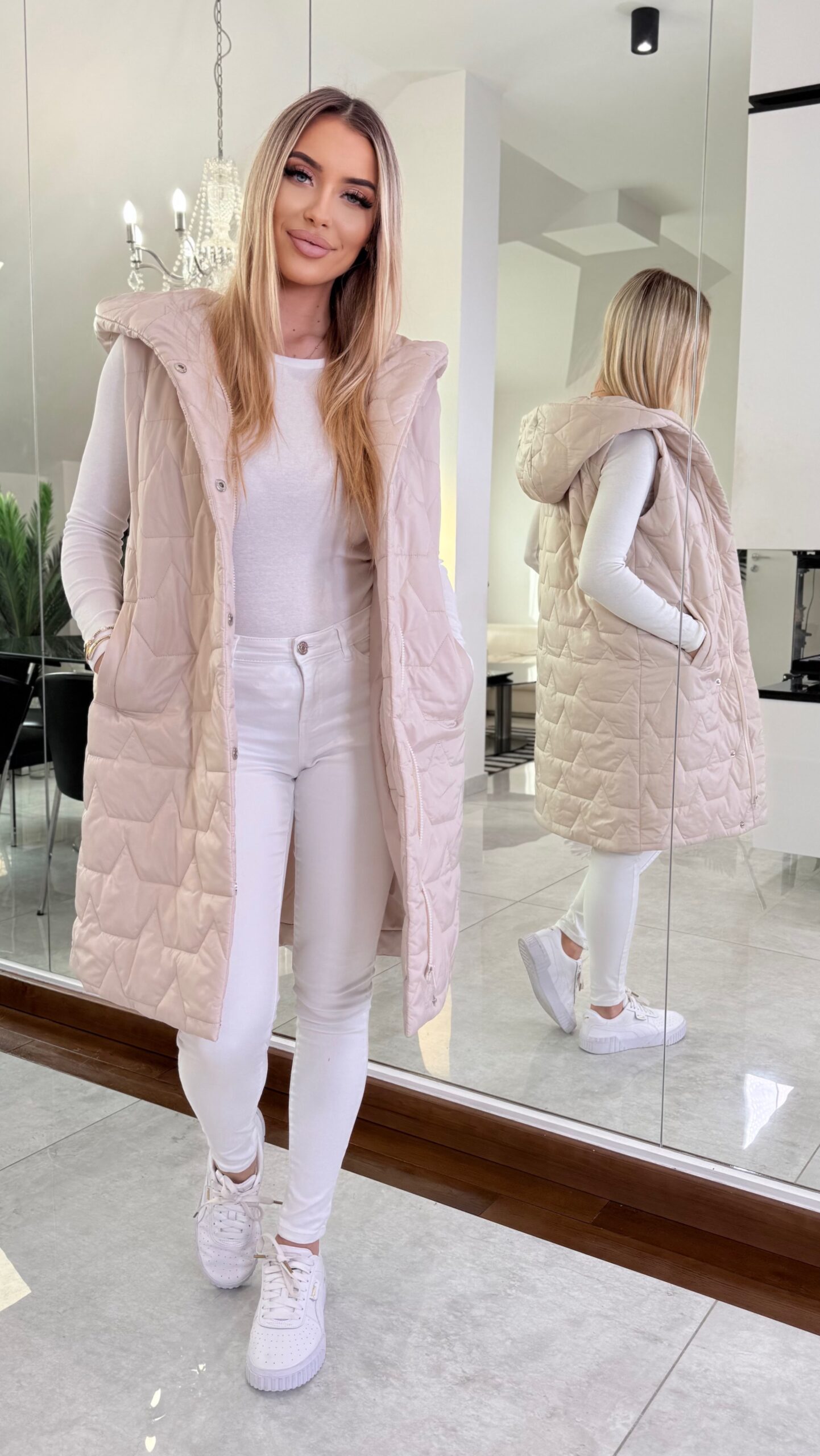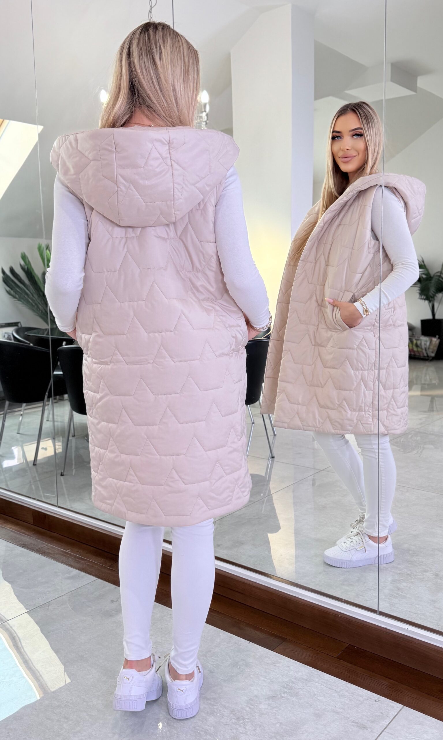 Stylowa i funkcjonalna długa kamizelka damska to doskonały wybór na sezon wiosna–lato. Wykonana w 100% z wysokiej jakości poliestru, jest lekka, wygodna i łatwa w pielęgnacji, dzięki czemu świetnie sprawdzi się w codziennym użytkowaniu. Wydłużony krój pięknie modeluje sylwetkę, a pikowana struktura nadaje całości nowoczesnego charakteru. Kamizelka została wyposażona w praktyczny kaptur, który zapewnia ochronę przed wiatrem, oraz wygodne zapięcie na suwak i napy. Funkcjonalne kieszenie zwiększają komfort noszenia, pozwalając mieć najpotrzebniejsze rzeczy zawsze pod ręką. Model dostępny jest w dwóch uniwersalnych kolorach: klasycznym czarnym oraz delikatnym beżowym, które łatwo dopasować do różnych stylizacji – zarówno sportowych, jak i casualowych.